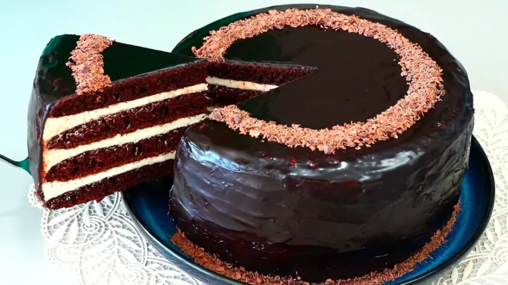 Змішайте цукор, какао, молоко і доведіть до кипіння на середньому вогні, постійно помішуючи. Додайте масло, розмішайте і остудіть. Полийте торт зверху і по боках, прикрасьте натертим шоколадом.