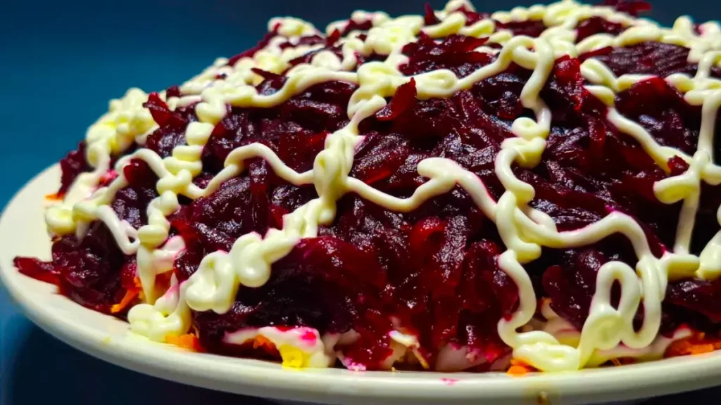 - Буряк — фінальний шар, теж злегка змастити майонезом.