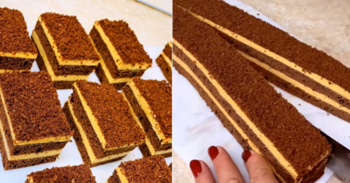 Далі змащуємо його повністю кремом і посипаємо подрібненою бісквітною крихтою.
