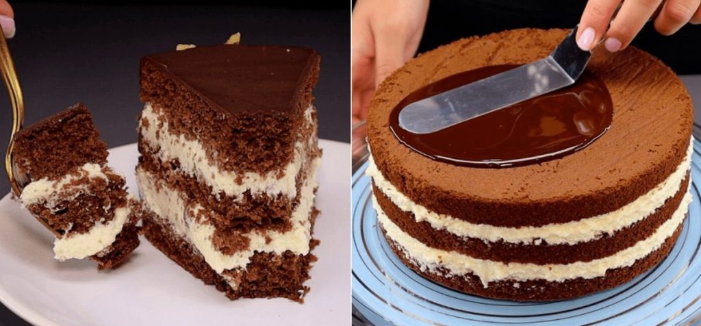 - Покриваємо торт глазур’ю і присипаємо горішками. Для глазурі розтоплюємо 100 г темного шоколаду та 60 г вершкового масла. Робимо це на водяній бані. Глазурі даємо повністю охолонути і лише після цього декоруємо нею торт.