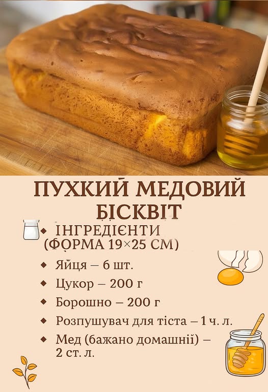 Інгредієнти для медового бісквіта (форма 19×25 см)