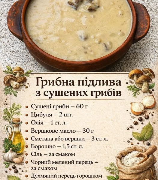 Інгредієнти: Сушені гриби – 50 г Цибуля – 3 шт. Олія – 2 ст. л. Вершкове масло – 20 г Сметана або вершки – 2 […]