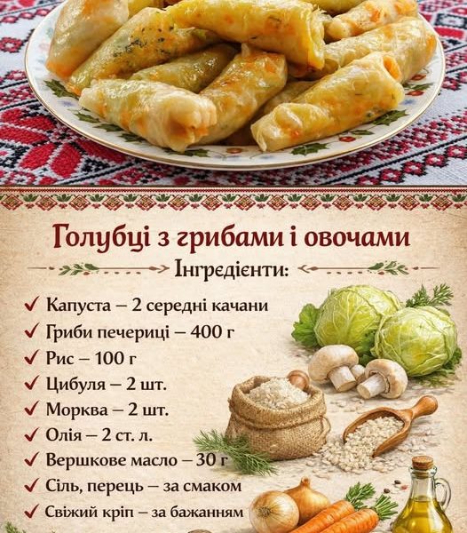 Порції: 6–8 Інгредієнти Капуста — 2 середні качани Гриби печериці — 400 г Рис — 100 г Цибуля — 2 шт. Морква — 2 шт. […]
