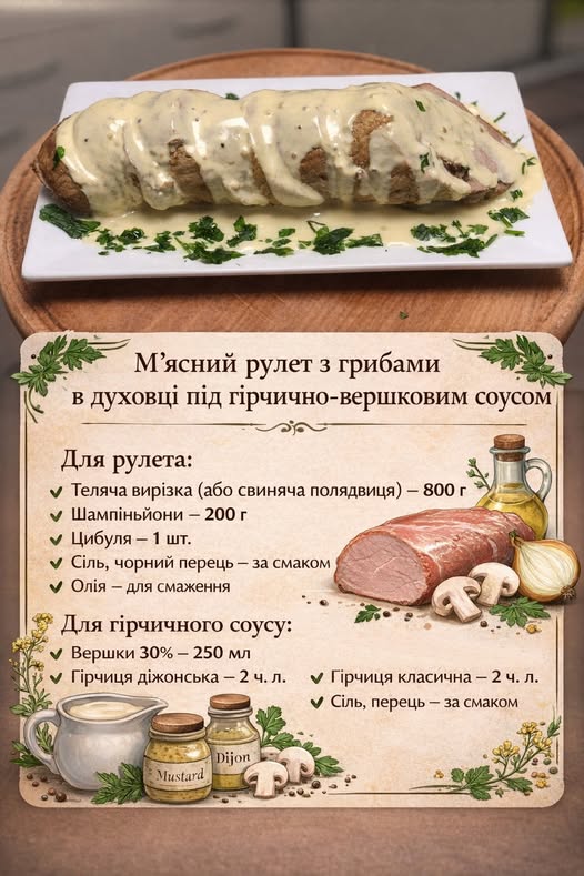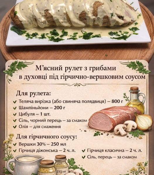 М’ясний рулет з грибами в духовці під гірчично-вершковим соусом
