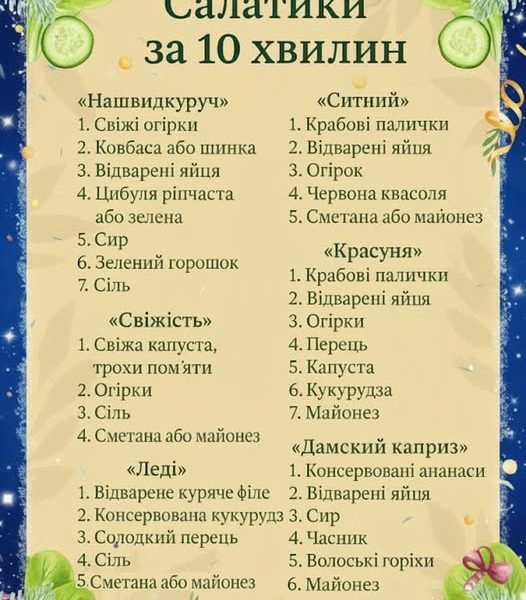 «Нашвидкуруч» Інгредієнти: Свіжі огірки — 2 шт. Ковбаса або шинка — 100 г Відварені яйця — 2 шт. Цибуля (ріпчаста або зелена) — 1 шт. […]