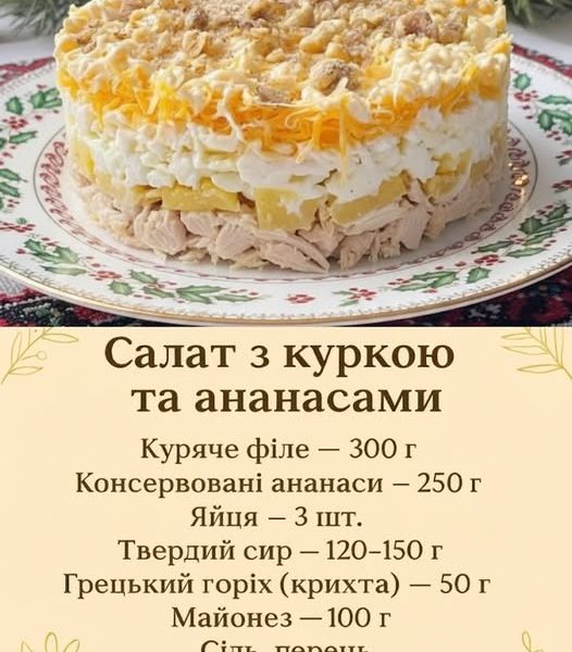 Інгредієнти (на 3–4 порції): Куряче філе — 300 г Консервовані ананаси (без сиропу) — 250 г Яйця — 3 шт. Твердий сир — 120–150 г […]