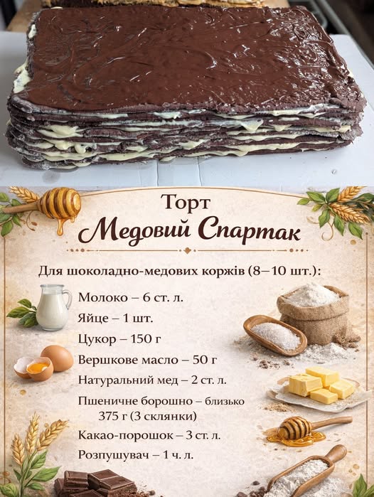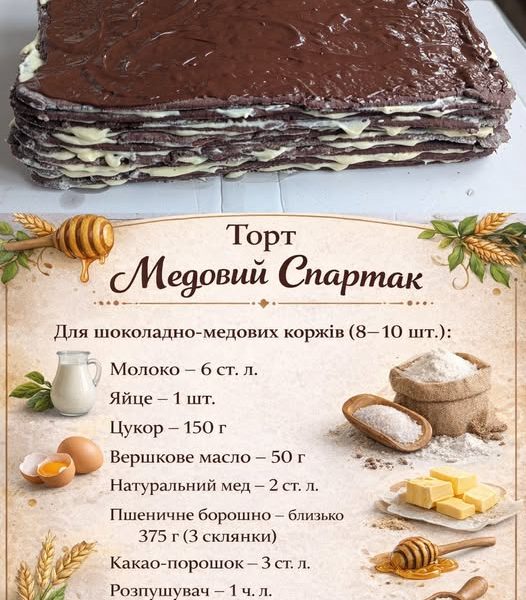 Насичений шоколадно-медовий торт із тонкими коржами та ніжним заварним кремом на маслі. Класика, яка завжди вражає після нічного настоювання.