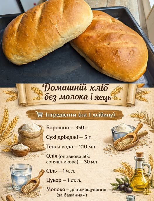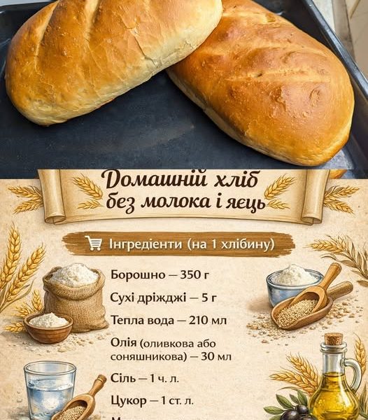 Хліб виходить м’який, пористий, із апетитною скоринкою. Готується легко навіть для новачків і підходить для дітей, посту та людей з алергіями.