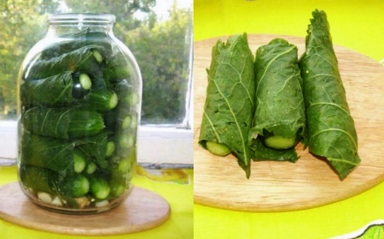 Беремо листя хрону і вирізаємо жорстку частину. Потім загортаємо в них кожен огірочок і щільненько утрамбовуємо їх в банку. Перед цим на дно ємності укладаємо парасольки кропу, листочки малини і часник.