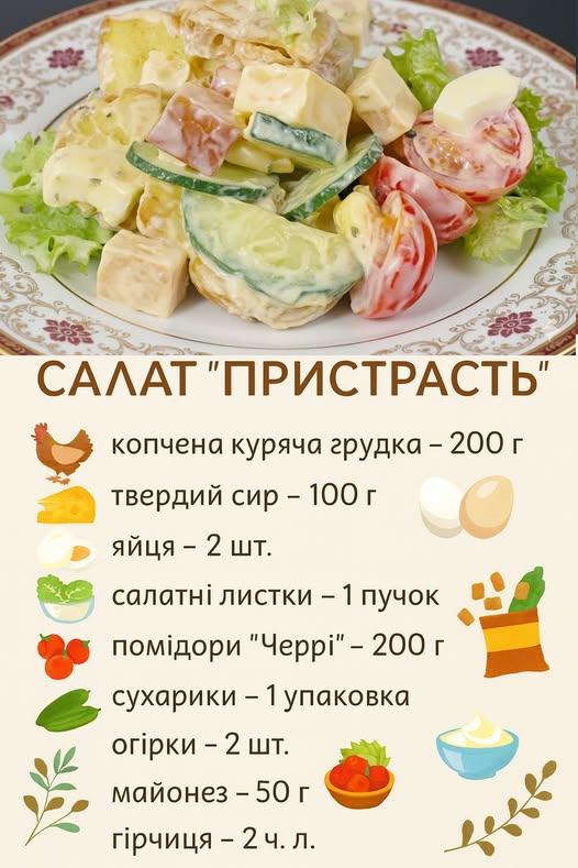 Цей салат точно підкорить серце кожного! Легкий у приготуванні, з апетитним поєднанням копченої курочки, свіжих овочів і пікантної заправки. Подавайте для романтичної вечері, святкового столу чи просто тоді, коли хочеться чогось особливого.