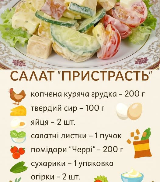 Цей салат точно підкорить серце кожного! Легкий у приготуванні, з апетитним поєднанням копченої курочки, свіжих овочів і пікантної заправки. Подавайте для романтичної вечері, святкового столу чи просто тоді, коли хочеться чогось особливого.