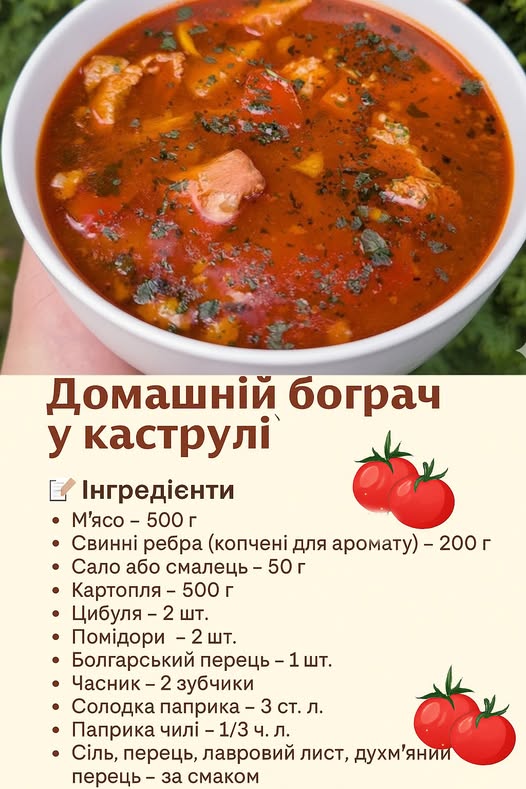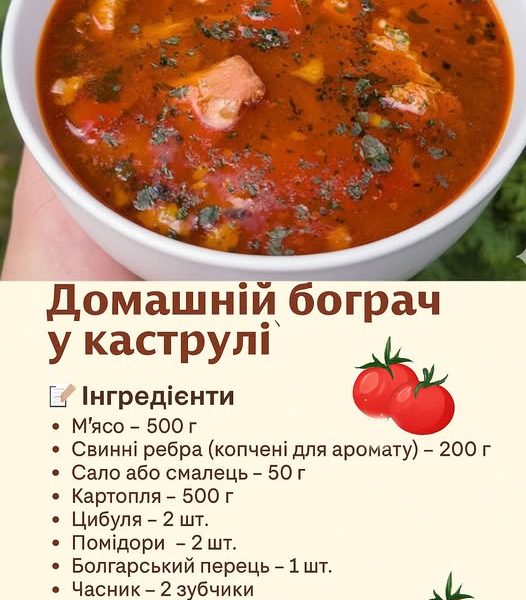 Домашній бограч у каструлі — це густий, пряний та насичений суп-гуляш, який легко приготувати на плиті. Навіть без казана він виходить неймовірно ароматним.