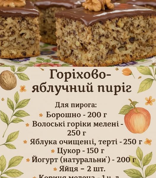 Інгредієнти Для пирога: Борошно пшеничне: 200 г Волоські горіхи мелені: 250 г Яблука очищені, терті: 250 г (приблизно 2 середніх яблука) Цукор: 150 г Йогурт […]