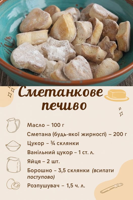Це печиво готується на сметані та вершковому маслі, воно м’яке всередині й злегка хрустке по краях. Ідеальний рецепт для домашнього чаювання.