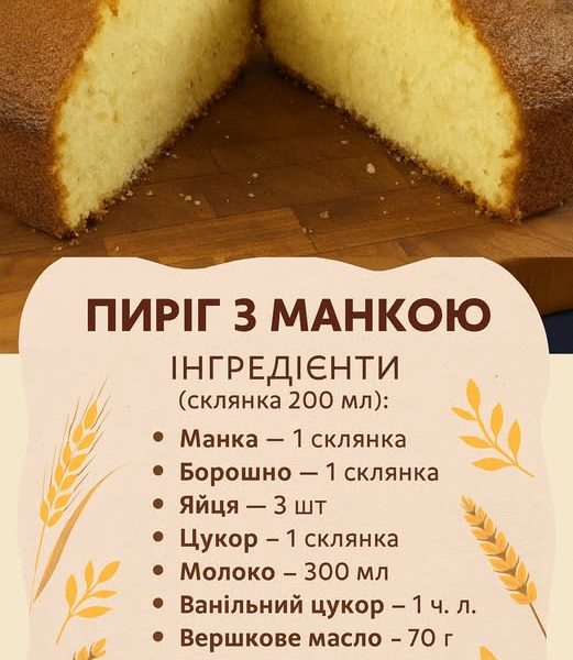 Форма 22–24 см (кругла) або 20×25 см (прямокутна). Це оптимальна кількість тіста, щоб пиріг рівномірно пропікся і був ніжним. Інгредієнти (склянка 200 мл): Манка — […]