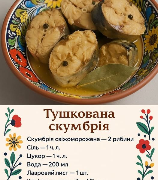 Інгредієнти: Скумбрія свіжоморожена — 1,2 кг (2 великі рибини) Сіль — 1 ч. л. Цукор — 1 ч. л. Вода — 200 мл Лавровий лист […]