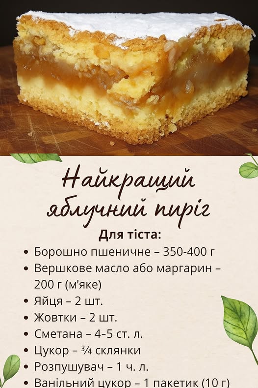 Ніжне пісочне тісто, ароматні яблука з легкою кислинкою та солодка цукрова пудра зверху — цей пиріг пахне теплом, затишком і домашнім спокоєм. Простий у приготуванні, а результат — неймовірно ніжний та смачний!