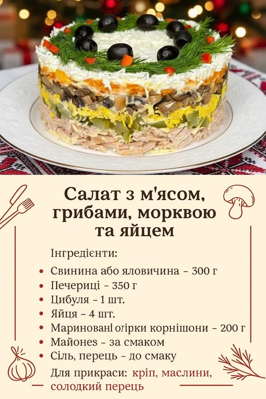 Цей салат чудово тримає форму, виглядає ефектно на столі та має збалансований смак. Особливо сподобається любителям м’ясних і грибних салатів.