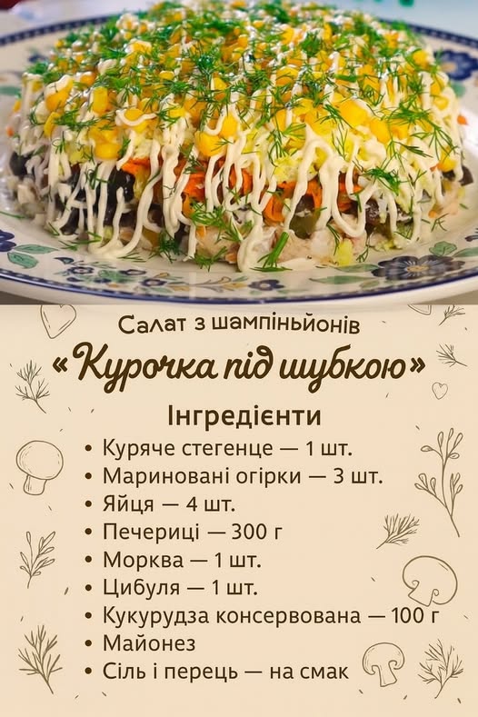 Салат з курки та шампіньйонів “Курочка під шубкою”