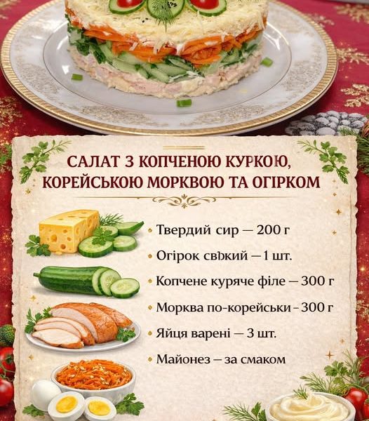 ІНГРЕДІЄНТИ: Твердий сир — 200 г Огірок свіжий — 1 шт. Копчене куряче філе — 300 г Морква по-корейськи — 300 г Яйця варені — […]