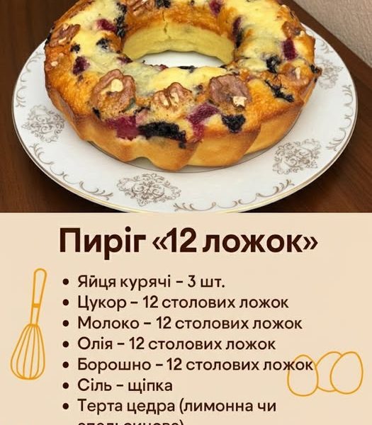 Інгредієнти: Яйця — 3 шт. Цукор — 12 ст. л. Молоко (краще жирне) — 12 ст. л. Олія рафінована — 12 ст. л. Борошно — […]