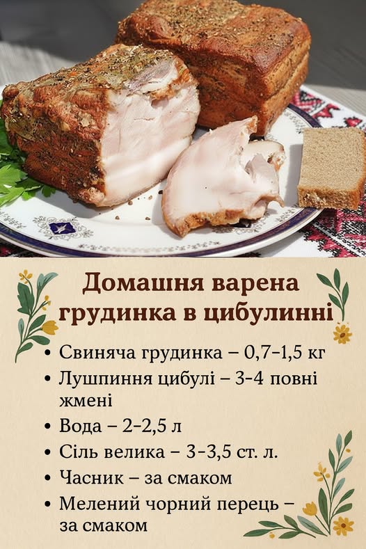 Ця домашня варена грудинка виходить смачною: ніжне м’ясо, апетитний колір і насичений аромат. Для приготування не потрібні жодні спеціальні пристрої — лише звичайна каструля, лушпиння цибулі та улюблені спеції.