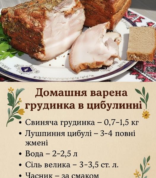 Ця домашня варена грудинка виходить смачною: ніжне м’ясо, апетитний колір і насичений аромат. Для приготування не потрібні жодні спеціальні пристрої — лише звичайна каструля, лушпиння цибулі та улюблені спеції.