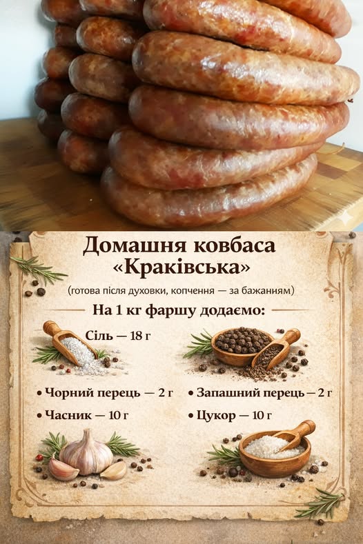 Я не люблю магазинну ковбасу, тому вирішив приготувати справжню домашню краківську. Рецепт простий, без зайвої хімії, а результат — ароматна, соковита ковбаса з насиченим м’ясним смаком.