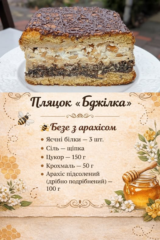 Білки з сіллю збити до легкої піни. Поступово всипати цукор і збивати до густої, блискучої маси. Додати крохмаль, коротко збити. Вмішати арахіс лопаткою.