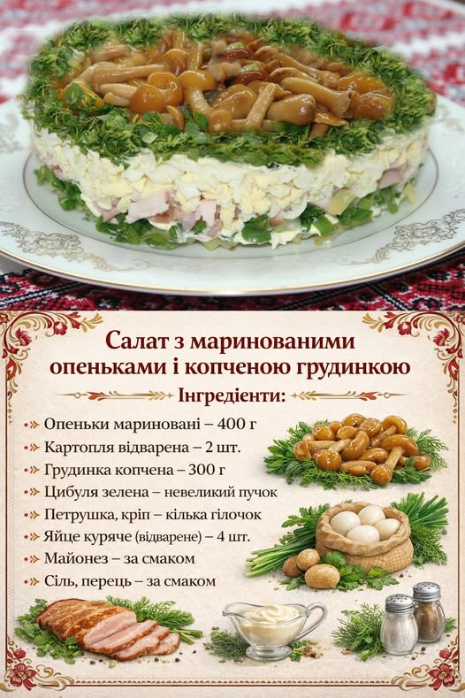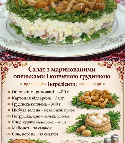 Салат готовий! Він чудово виглядає на святковому столі та має насичений смак завдяки маринованим опенькам і копченій грудинці.