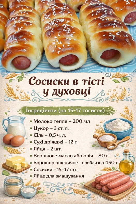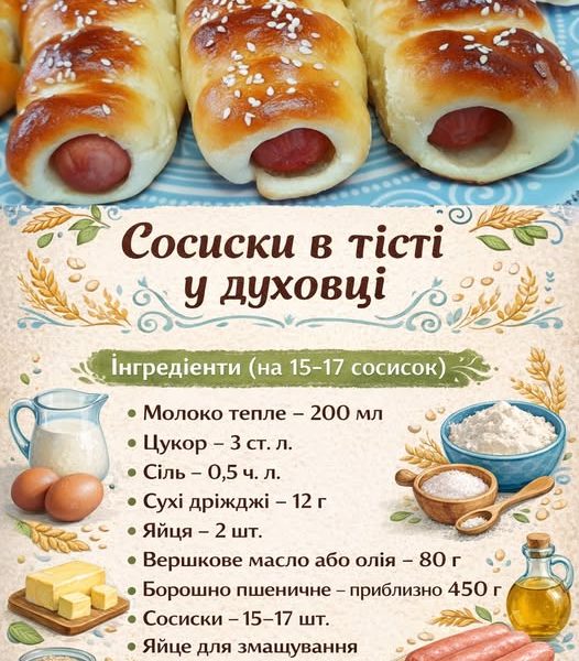 Смачні сосиски в м’якому дріжджовому тісті. Ідеальні для сніданку, перекусу або дитячого святкового столу!