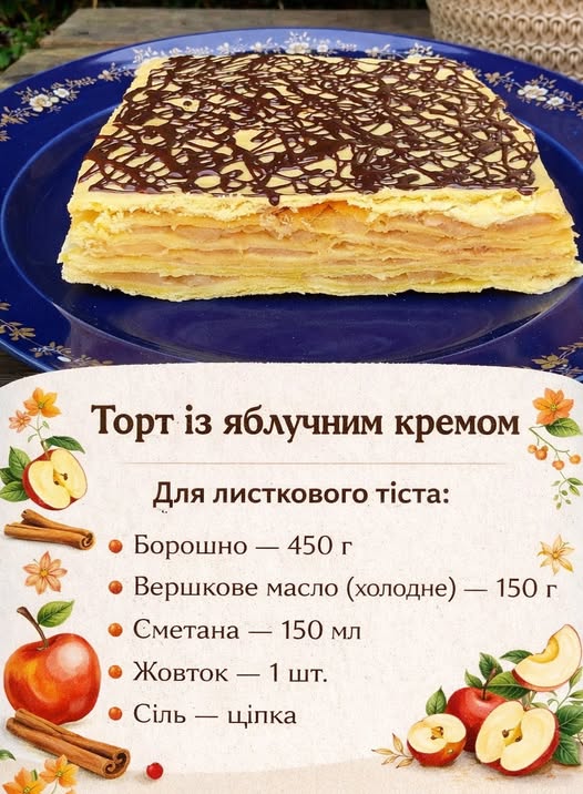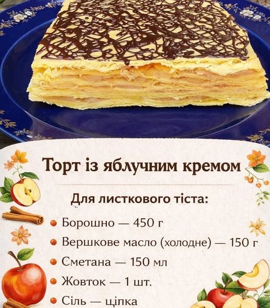 Коржі перемазуйте теплим яблучним кремом, складаючи один на один.