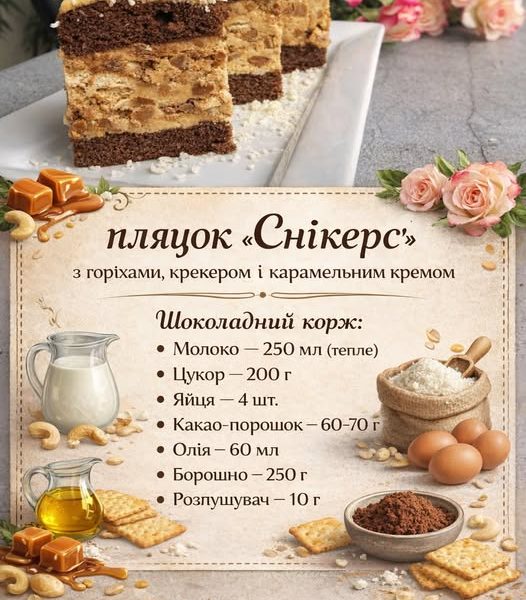 Форма 20×25 см Інгредієнти Шоколадний корж: Молоко — 250 мл (тепле) Цукор — 200 г Яйця — 4 шт. Какао-порошок — 60–70 г Олія — […]