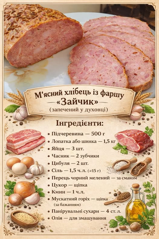 Домашній м’ясний хлібець «Зайчик» — це щільна, ароматна м’ясна закуска, яка чудово нарізається скибками, не кришиться й ідеально підходить як для святкового столу, так і для бутербродів.