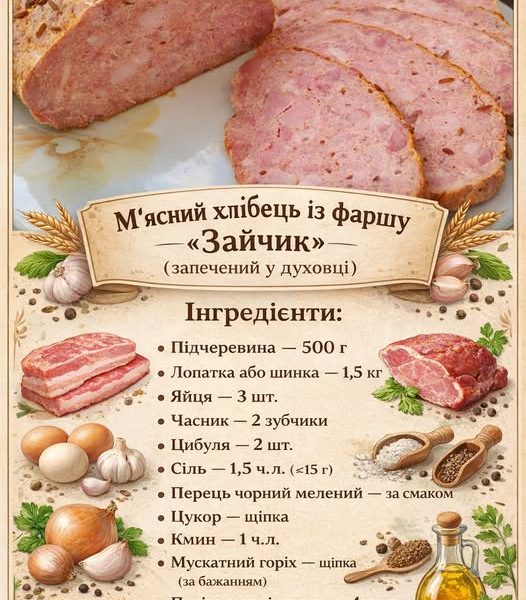 Домашній м’ясний хлібець «Зайчик» — це щільна, ароматна м’ясна закуска, яка чудово нарізається скибками, не кришиться й ідеально підходить як для святкового столу, так і для бутербродів.