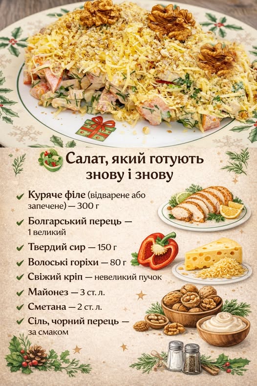 Жодних складних технік — лише ідеальний баланс смаків. Ніжна курка, соковитий перець, ароматний кріп, хрумкі горіхи та сирна шапка…