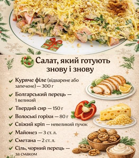 Жодних складних технік — лише ідеальний баланс смаків. Ніжна курка, соковитий перець, ароматний кріп, хрумкі горіхи та сирна шапка…