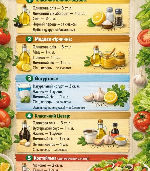 5 перевірених рецептів заправок для салатів Олійно-оцтова класика Ніжний баланс олії та кислоти: Оливкова олія — 3 ст. л. Лимонний сік або оцет — 1 […]
