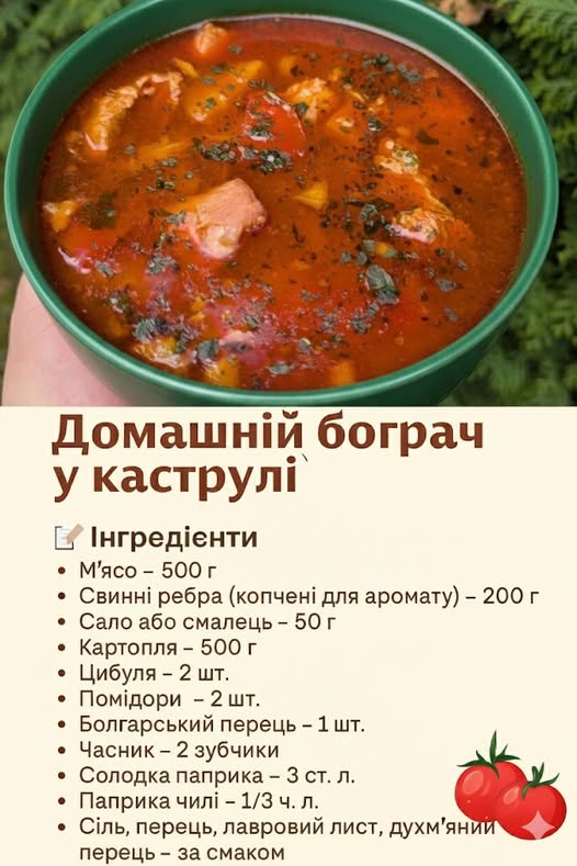 Домашній бограч у каструлі — це густий, зігріваючий суп-гуляш із м’ясом, картоплею та великою кількістю паприки. Його легко приготувати просто на плиті, навіть якщо під рукою немає казана. Смак виходить глибокий, пряний і дуже ароматний — майже як на вогні.