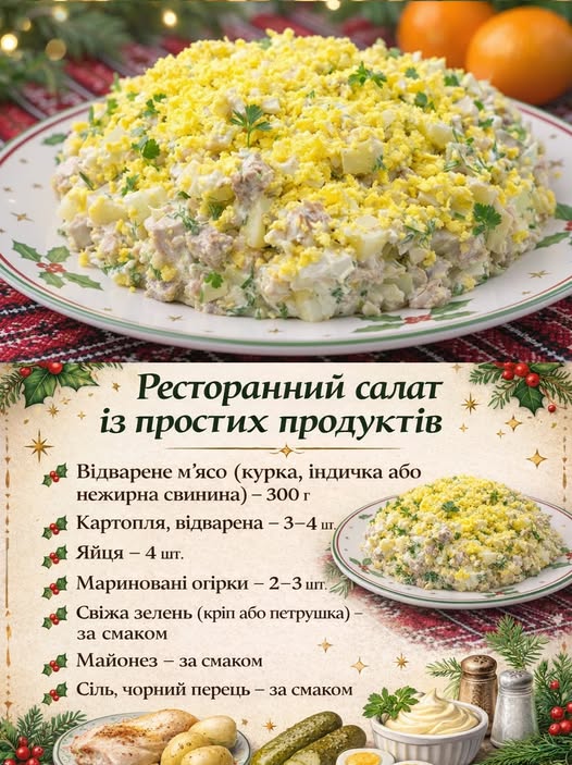 У ресторанах салат викладають акуратною гіркою на білій тарілці, посипають тертим жовтком і прикрашають свіжою зеленню. Просто, лаконічно й дуже апетитно — саме так, як на фото.