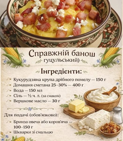 Банош — це не просто страва, а частина карпатської душі. Ніжний, вершковий, з ароматом сметани та солоної бринзи. Якщо дотримуватися правил — смак буде ідеальний ![]()