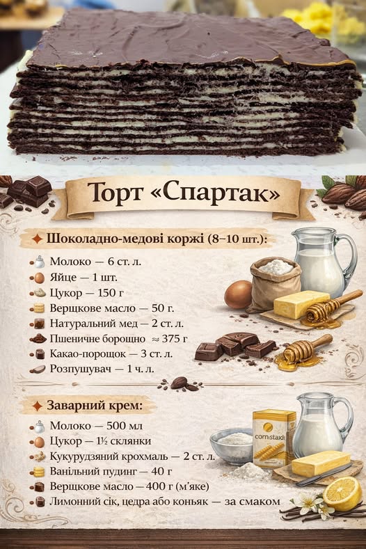 Цей торт недарма вважають легендою: тонкі шоколадно-медові коржі, які після просочення стають м’якими, ідеально поєднуються з насиченим заварним кремом на маслі. «Спартак» завжди виглядає ефектно й смакує ще краще наступного дня.