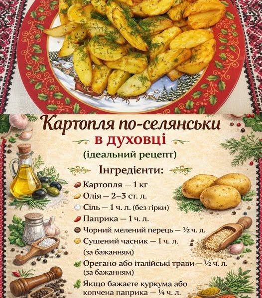 Інгредієнти: Картопля — 1 кг Рослинна олія — 2–3 ст. л. Сіль — 1 ч. л. (без гірки) Паприка — 1 ч. л. Чорний мелений […]