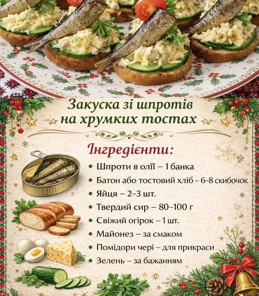 Проста, швидка та дуже ефектна закуска. Інгредієнти: Шпроти в олії — 1 банка Батон або тостовий хліб — 6–8 скибочок Яйця — 2–3 шт. Твердий […]
