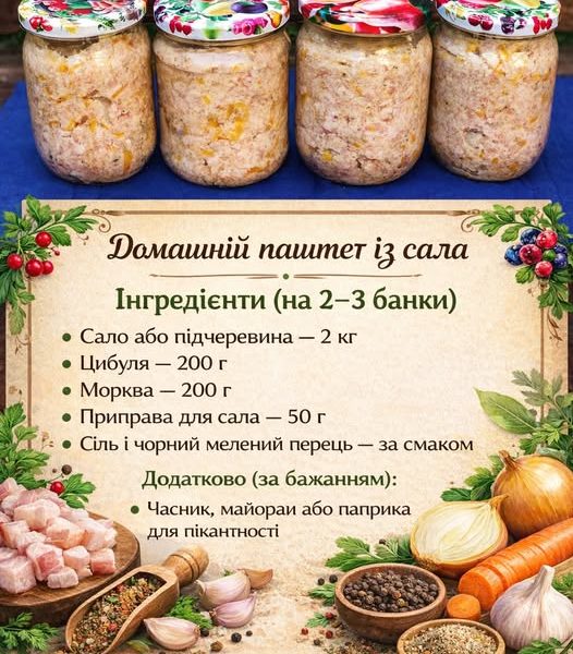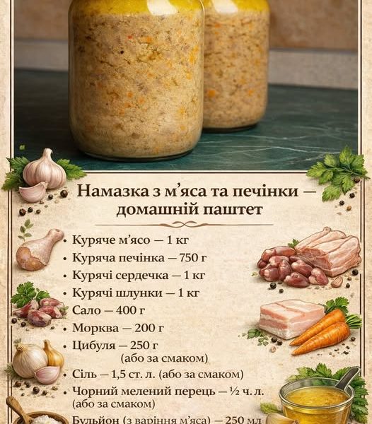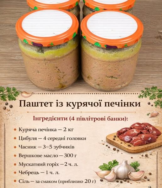 Інгредієнти (4 півлітрові банки): Куряча печінка — 2 кг Цибуля — 4 середні головки Часник — 3–5 зубчиків Вершкове масло — 300 г Мускатний горіх […]