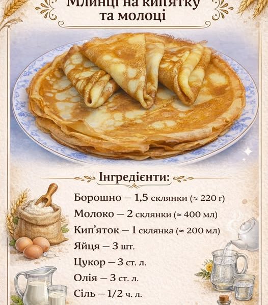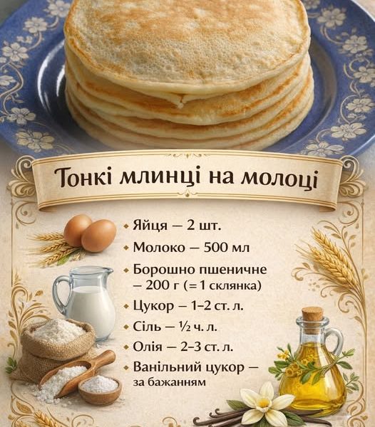 Інгредієнти: Яйця — 2 шт. Молоко — 500 мл Борошно пшеничне — 200 г (≈ 1 склянка) Цукор — 1–2 ст. л. Сіль — ½ […]