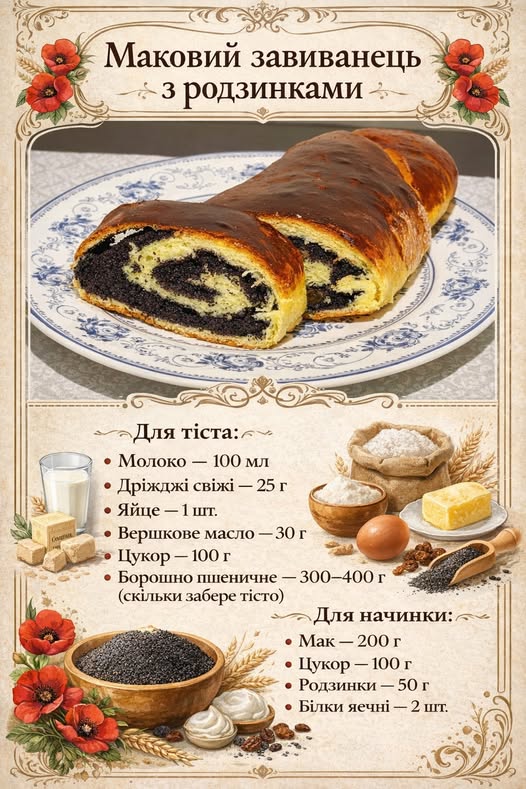 Маковий завиванець з родзинками — ароматна випічка на дріжджовому тісті