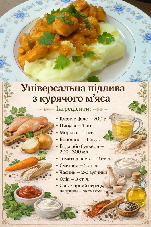 Подавайте гарячою з картопляним пюре, відварною картоплею, рисом, гречкою або макаронами. Соус виходить насиченим, ніжним і дуже ароматним.