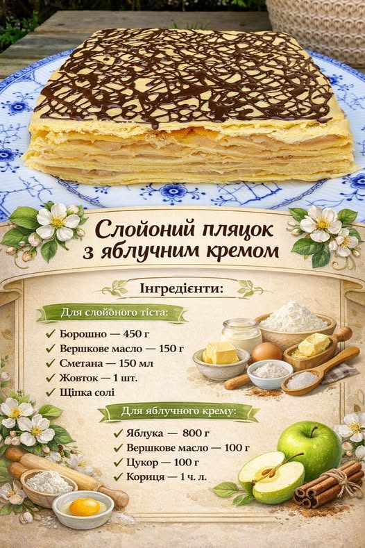 Ніжний, ароматний та по-справжньому домашній пляцок із тонких слойоних коржів та густого яблучного крему з корицею. Ідеально смакує після нічного настоювання.